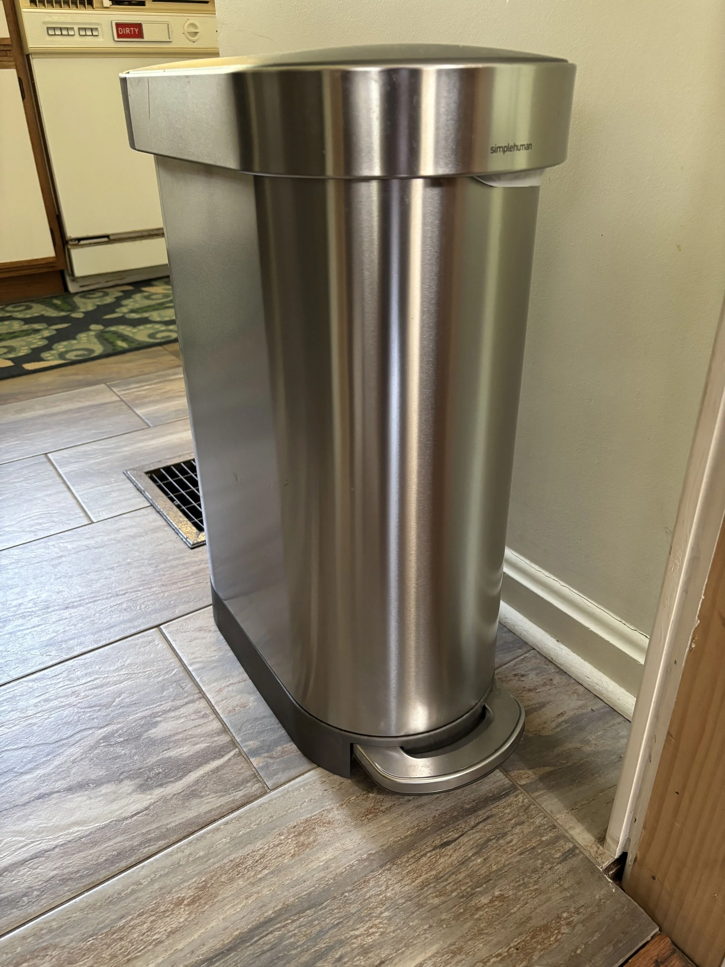 I am quite sure that Kathy would like a new Simplehuman for the kitchen, but she will have to make do with the current one for the next, say, 16 years. Simplehuman trash cans look great, but they are not simple enough, and this human is frustrated with them.