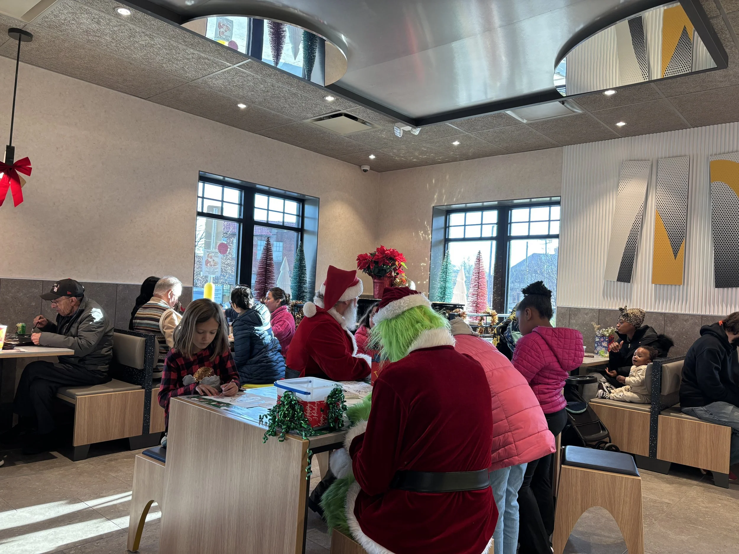 We arrived around 8 in the morning, and the place was packed. I had to wait for a parking space. The inside dining area looks to be about 75% of its previous size. Everyone was ordering at the kiosk (of which I am not a fan). The new player piano was playing, fortunately not Christmas tunes. Oh, and there were approximately one zillion kids there. As it happens, day two was also “Breakfast with Santa Claus Day” at the new Mickey D’s. There was a most genial Santa, sitting at a large table surrounded by kids, working on coloring those kiddie menus that magically appear at every restaurant. Santa’s helper was someone in a Grinch costume.